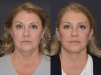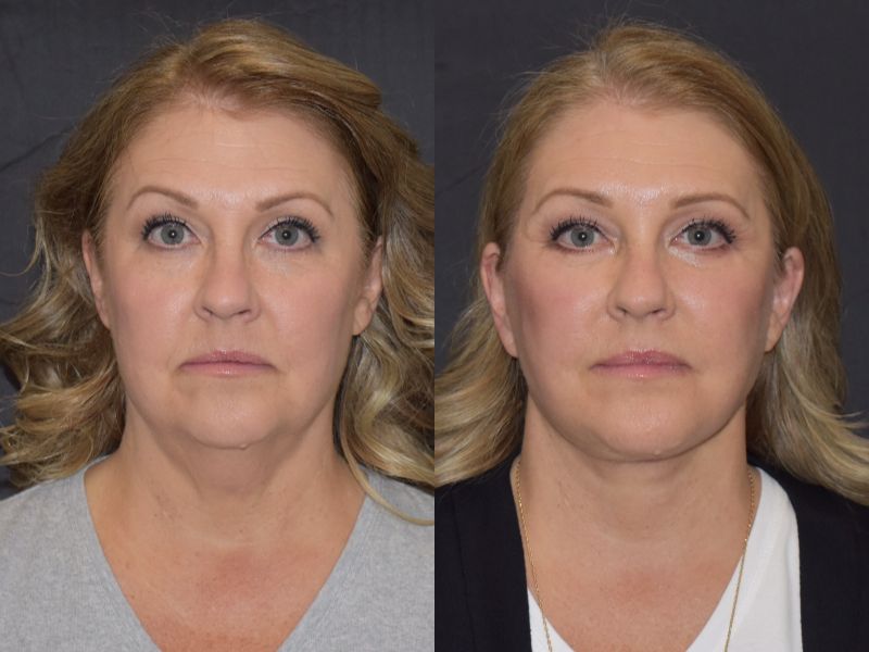 Patient in her mid 50s presented with jowls, droopy cheeks, heavy neck, and undereye bags. She is seen here 2 months post-operatively.